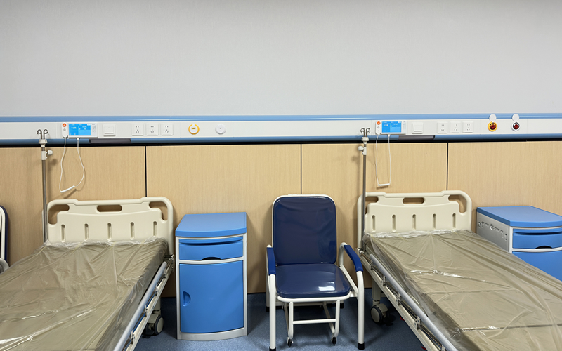山東魯南醫院東區新安裝中心供氧系統和負壓吸引系統,在一層設有獨立的中心供氧站和負壓吸引泵組,病房每個床位設立液晶顯示信息化呼叫器、閱讀燈、電源插座、吸引和氧氣德標DIN終端接口。