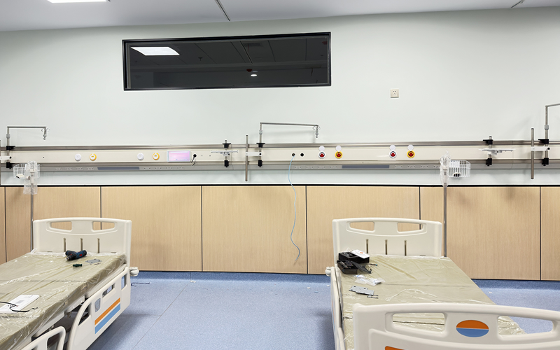 CCU病房采用多功能導軌式設備帶,床頭配置可移動式導軌托架、掛鉤、器械框以及醫用氣體和醫護對講設備。