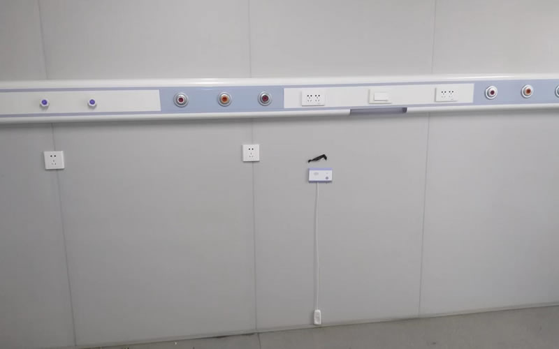 方艙醫院病房床頭安裝醫療設備帶,每個床位配備一個氧氣終端口、一個吸引終端口、一個空氣終端口和電源插座床頭燈以及緊急呼叫對講設備。