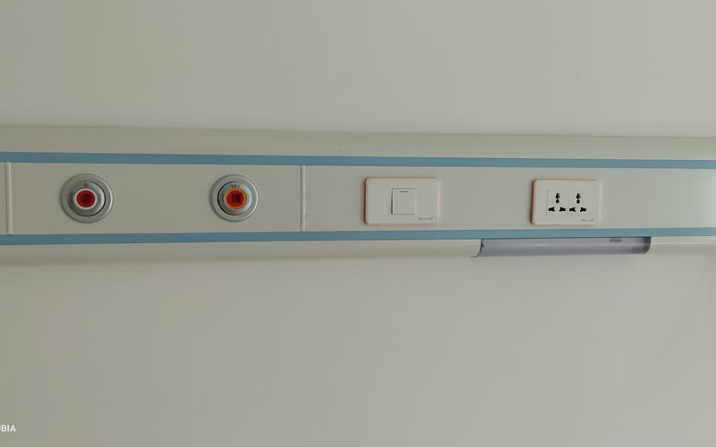 病房床頭選用優質鋁合金防靜電設備帶,中心供氧終端選用較為高檔的德標制式氧氣終端,以及德標真空負壓吸引終端。普通病房每個床位配置一個氧氣終端、一個吸引終端、一個六孔電源插座、一個LED閱讀燈、一個呼叫對講系統分機。
