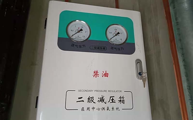醫(yī)用氧氣從制氧站或液氧儲罐輸出后,經(jīng)過一級減壓,通過主管道輸送至各樓層。由于管網(wǎng)較長、用氣點(diǎn)眾多,氧氣壓力可能因流量變化而波動。氧氣二級穩(wěn)壓箱通過內(nèi)置精密減壓閥和壓力表,將輸入的中壓氧氣(通常為0.4–0.6 MPa)再次減壓并穩(wěn)定輸出至0.4 MPa ± 0.02 MPa的標(biāo)準(zhǔn)終端壓力,確保各用氧點(diǎn)壓力恒定、供氧安全可靠。