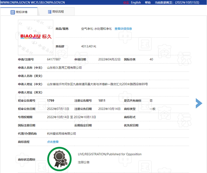 經國家商標總局sbj.cnipa.gov.cn網站查詢獲悉,我公司申請注冊的標久品牌注冊商標獲得批準。