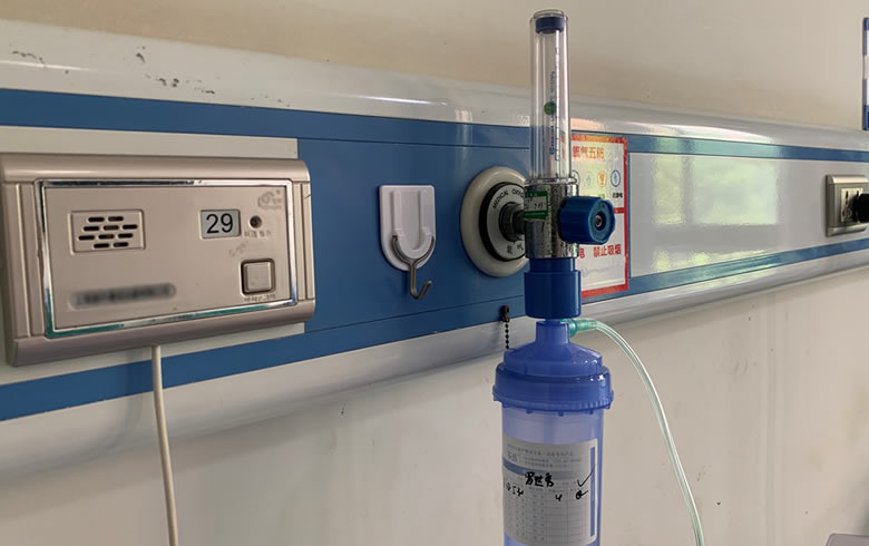 病房床頭安裝鋁合金設備帶,氧氣管道隱藏在其中,每個床頭安裝氧氣快速插座,可以用濕化瓶連接吸氧。濕化瓶里會裝純凈水,通過水濕化吸入使用時避免干燥不適。