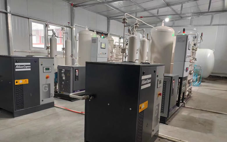 醫用制氧機,使用空壓機收集環境空氣,通過分子篩選出氧氣儲存和供應,氧氣濃度約93%,輸送至管道的壓力大約0.5map.