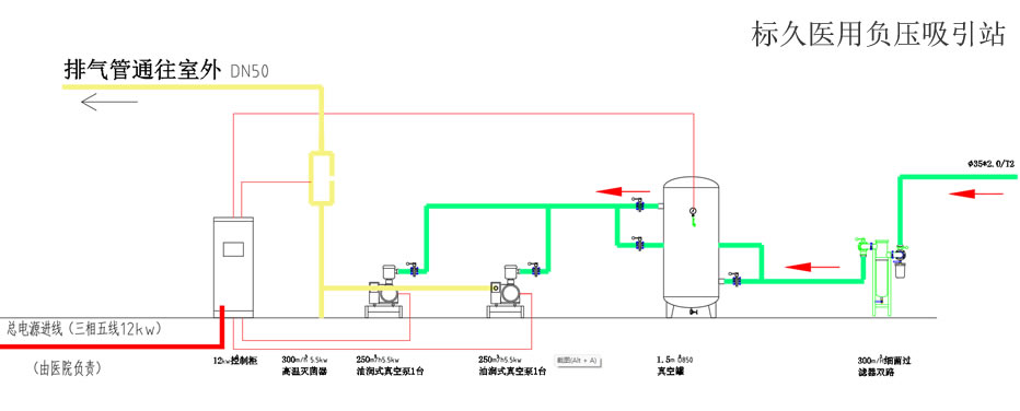 4、中心吸引站應設置應急備用電源并連接到站房配電箱,由院方負責。
