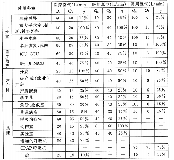 醫(yī)療空氣、醫(yī)用真空、醫(yī)用氧氣系統(tǒng)氣源的計(jì)算流量中的有關(guān)參數(shù),可按下表取值。