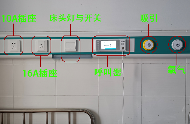 醫院普通病房床頭醫用設備帶上的設備,根據不同檔次及科室病房的具體需求一般會安裝:中心供氧系統氧氣、真空負壓、壓縮空氣、呼叫器分機、插座、照明、網絡口等醫用氣體和醫護輔助設備。