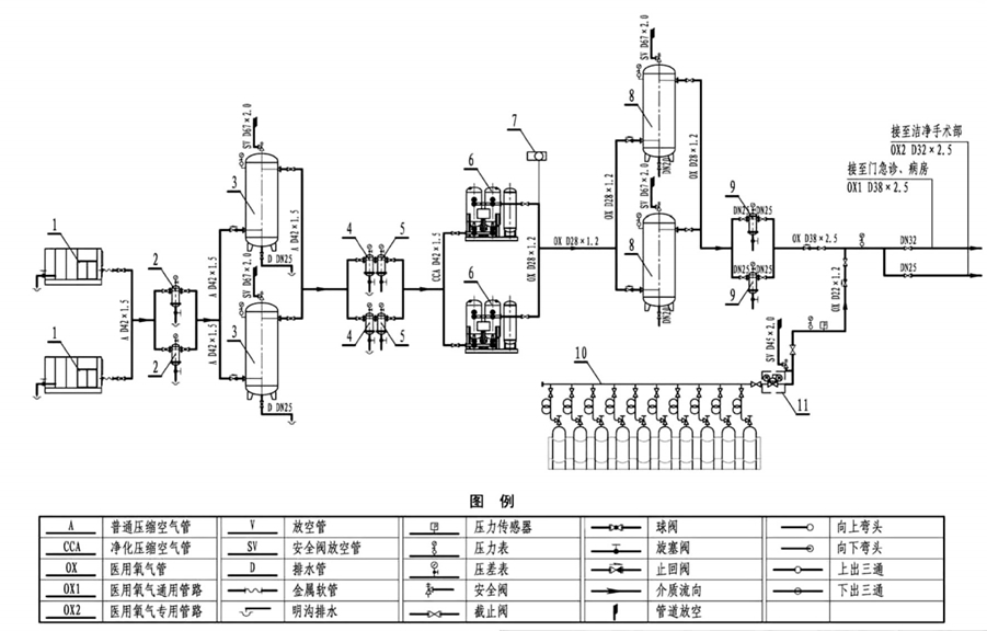 選擇供氧源:根據(jù)實(shí)際需要,可以選擇PSA制氧系統(tǒng)、液氧儲罐或瓶氧作為供氧源。需要注意的是,PSA制氧系統(tǒng)主要由空氣壓縮機(jī)和氧氣發(fā)生器組成,可以根據(jù)實(shí)際需要調(diào)節(jié)氧氣壓力,耗電較高,但安全可靠,適合在交通不便的地區(qū)使用。液氧儲罐的濃度為99.5%,由醫(yī)用液氧儲罐、汽化器和減壓裝置組成,需要注意單個醫(yī)用液氧儲罐的最大容積和單個液氧站安裝的液氧儲罐最大數(shù)量限制。瓶氧的濃度也為99.5%,是高壓氣態(tài)氧,常用作醫(yī)院的備用氣和應(yīng)急氣源。