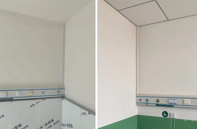 醫(yī)院病房床頭醫(yī)用氣體管道預(yù)埋開槽深度30mm左右,寬度60mm左右即可,兩根管道分別套兩根20mm的PVC管即可。預(yù)留高度一般為醫(yī)療設(shè)備帶中間位置,距離地面1350-1450mm的高度。注意電源線和呼叫線、以及網(wǎng)絡(luò)信號線等需要安裝到設(shè)備帶上的設(shè)備線路,也要預(yù)留到這個高度。每間病房同面墻體有兩張以上床位的時候,管線只需要預(yù)留一個點位的即可,其余延長部分可在設(shè)備帶內(nèi)變接。