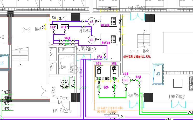 氣源部分的設(shè)計要特別注意:氧氣站房需要明確標注匯流排、汽化器、減壓裝置等關(guān)鍵設(shè)備的位置;真空泵房則要詳細標注設(shè)備基礎(chǔ)尺寸和排氣管道走向;備用系統(tǒng)的切換裝置也必須清晰標示。